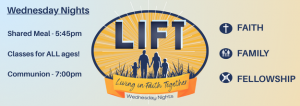Changes are coming to the Wednesday night program, including a name change; LOGOS is now LIFT – Living in Faith Together. We are excited for our revitalized program to kick off on January 14th with dinner at 5:45. Everyone is welcome to join us for a free dinner and a time of fellowship. After dinner children K-5th can attend a class just for them. This 45 minute fast paced class uses the Growing in God’s Love curriculum which includes a Bible story, an activity, and music. Adults can choose to attend Pastor Myer’s class or stay in the dining hall and continue fellowshipping. At 7:00 we celebrate communion in the Chapel; this short 15 minute worship service is for all who wish to attend.